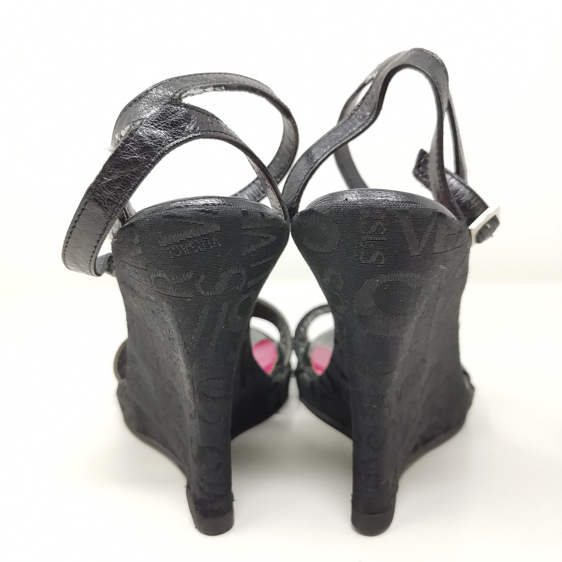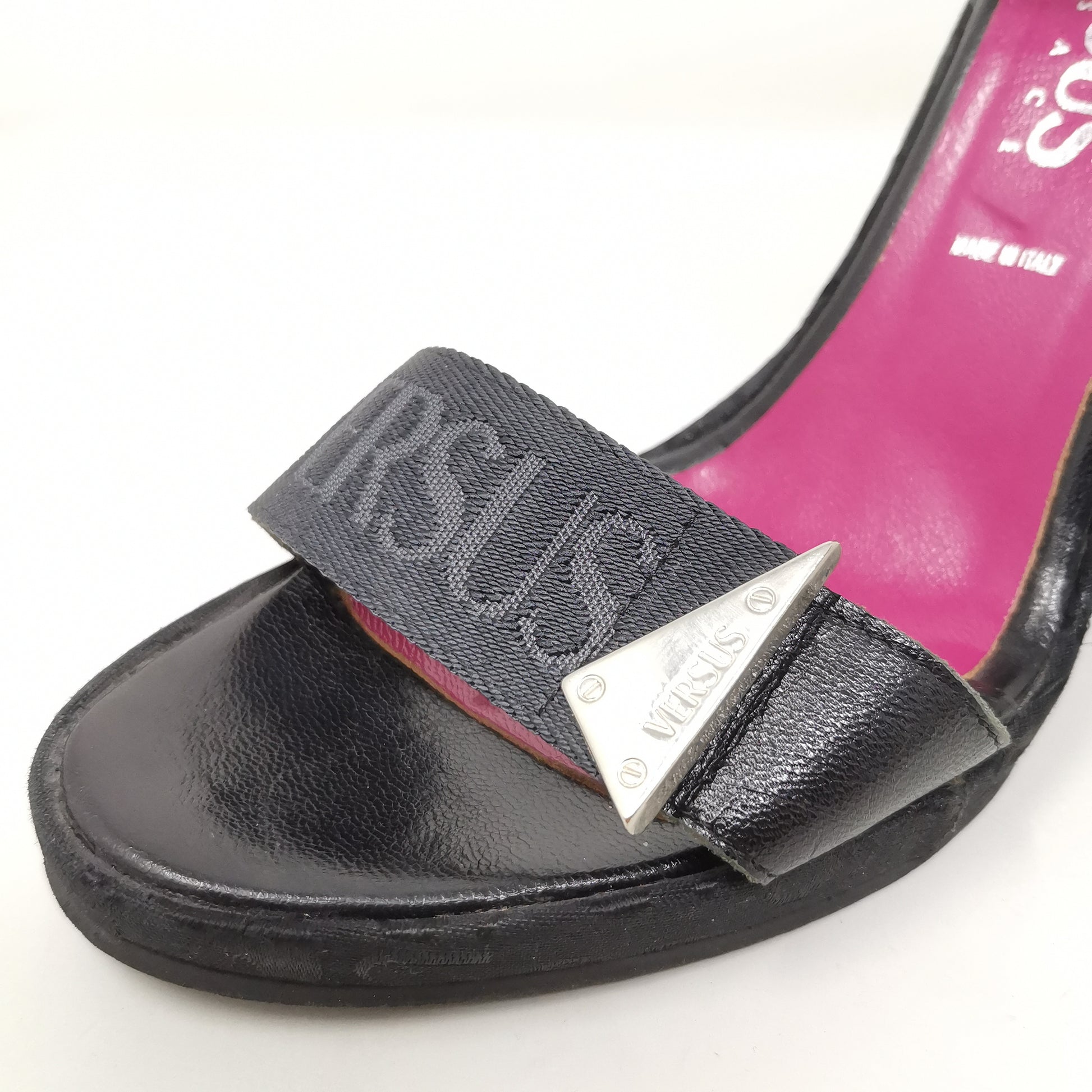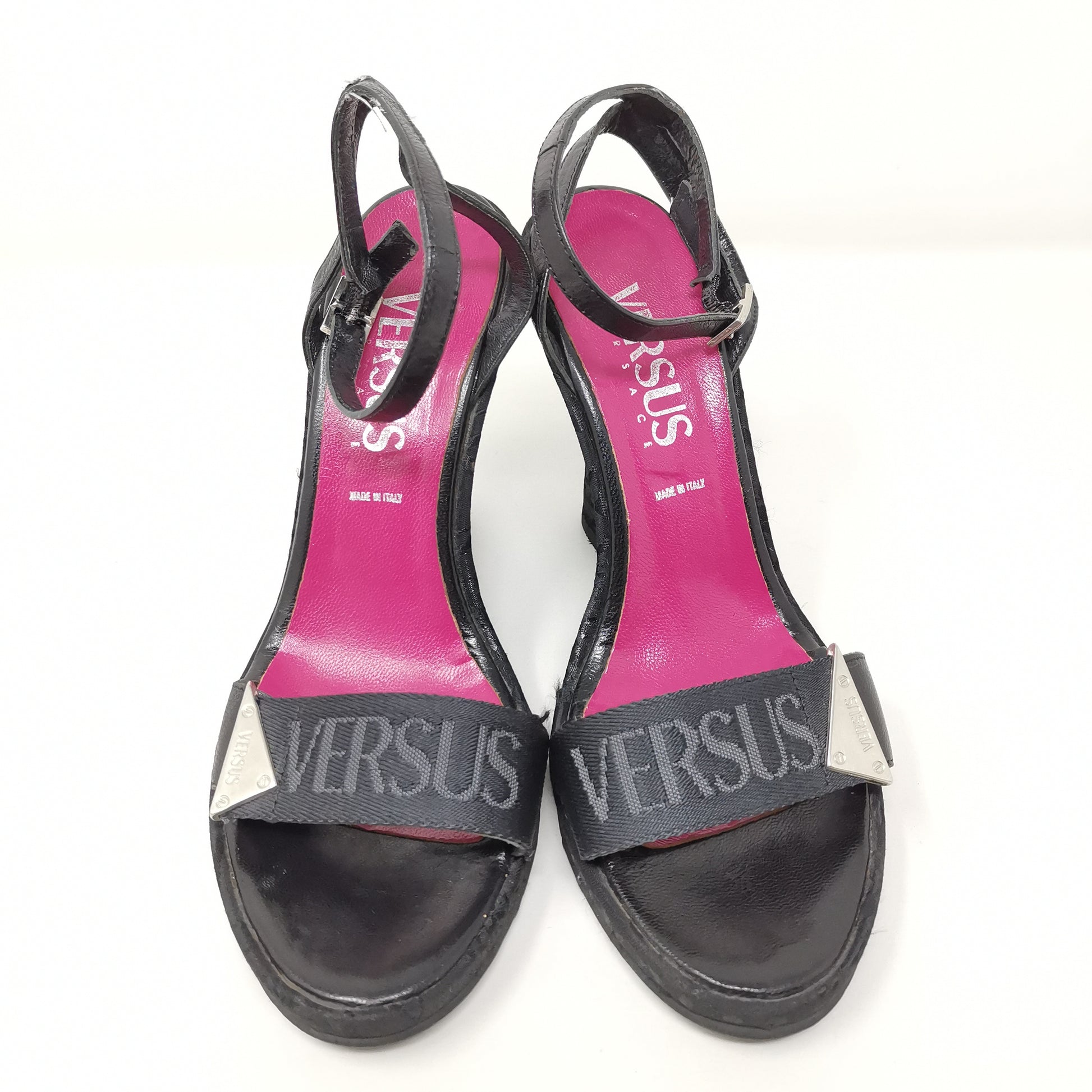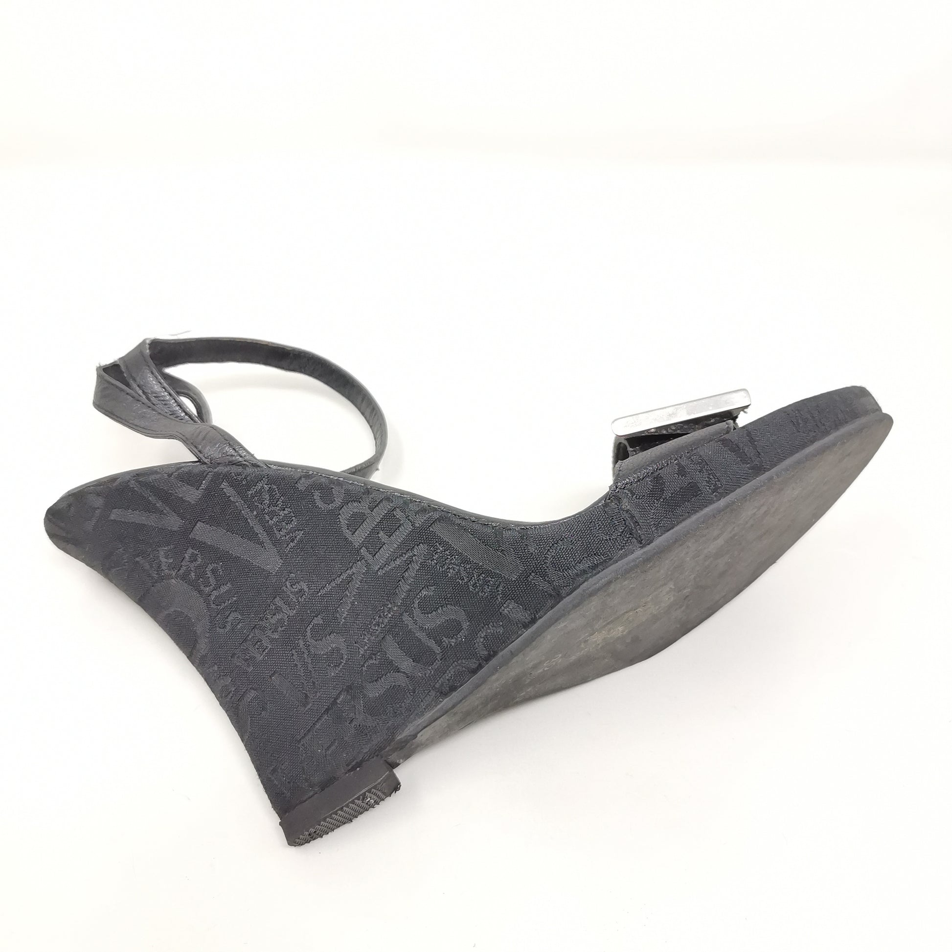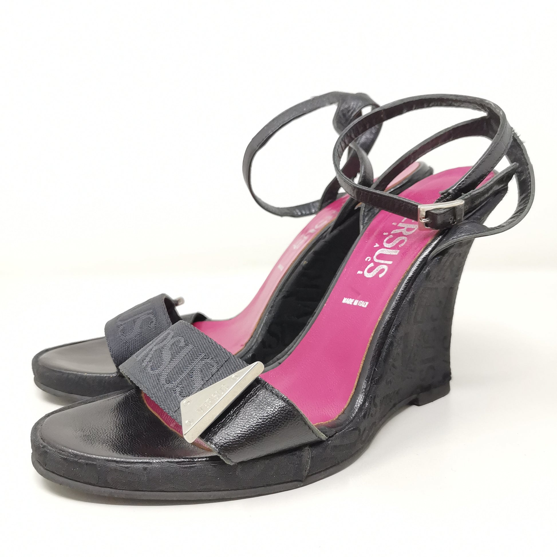 Versus by Versace sandals with 10.5 cm wedge and 1.3 cm platform. Adjustable ankle strap, leather insole measures 23cm, rubber outsole. Silver-colored metal plate with brand name engraved on the upper. A few small marks. Size 36 EU.