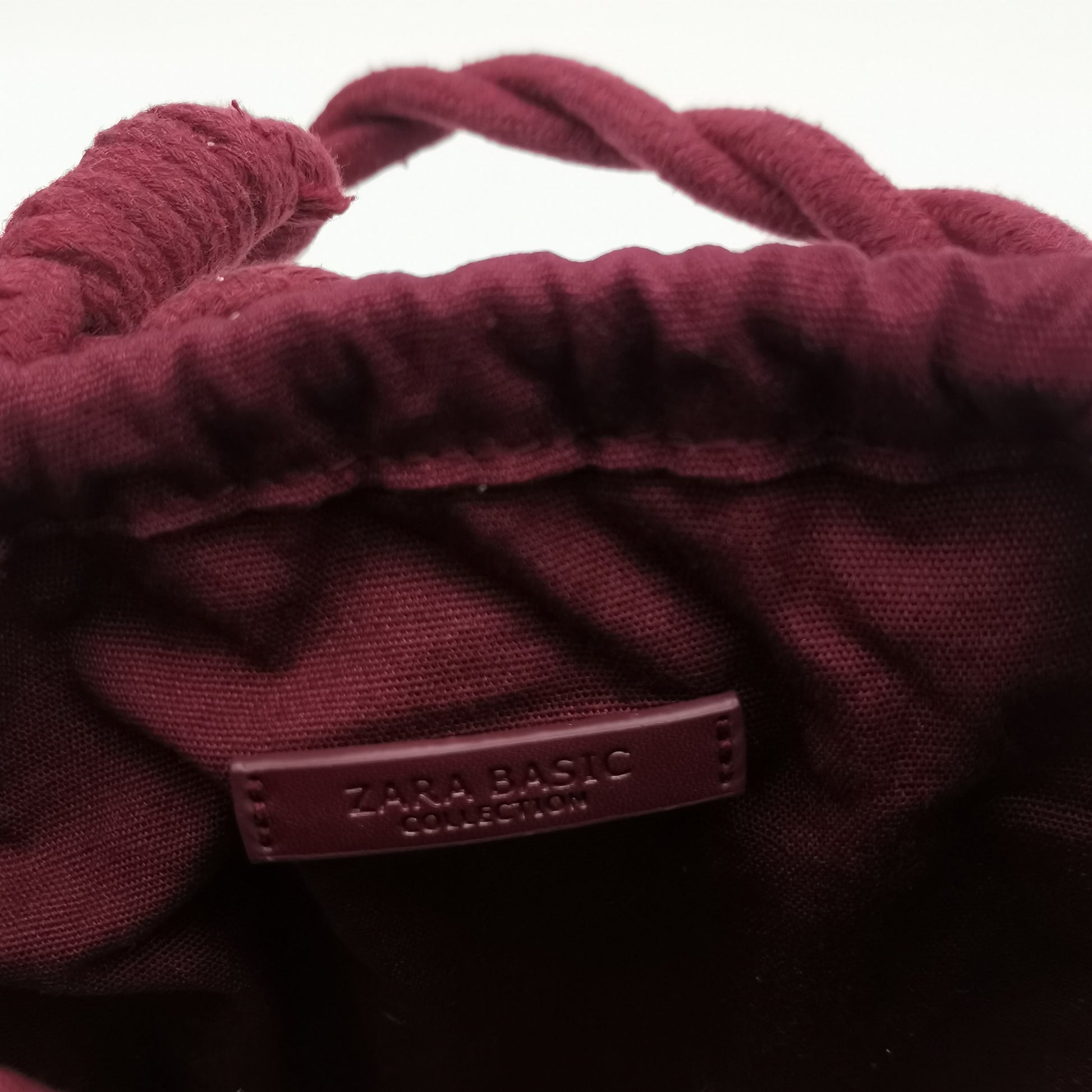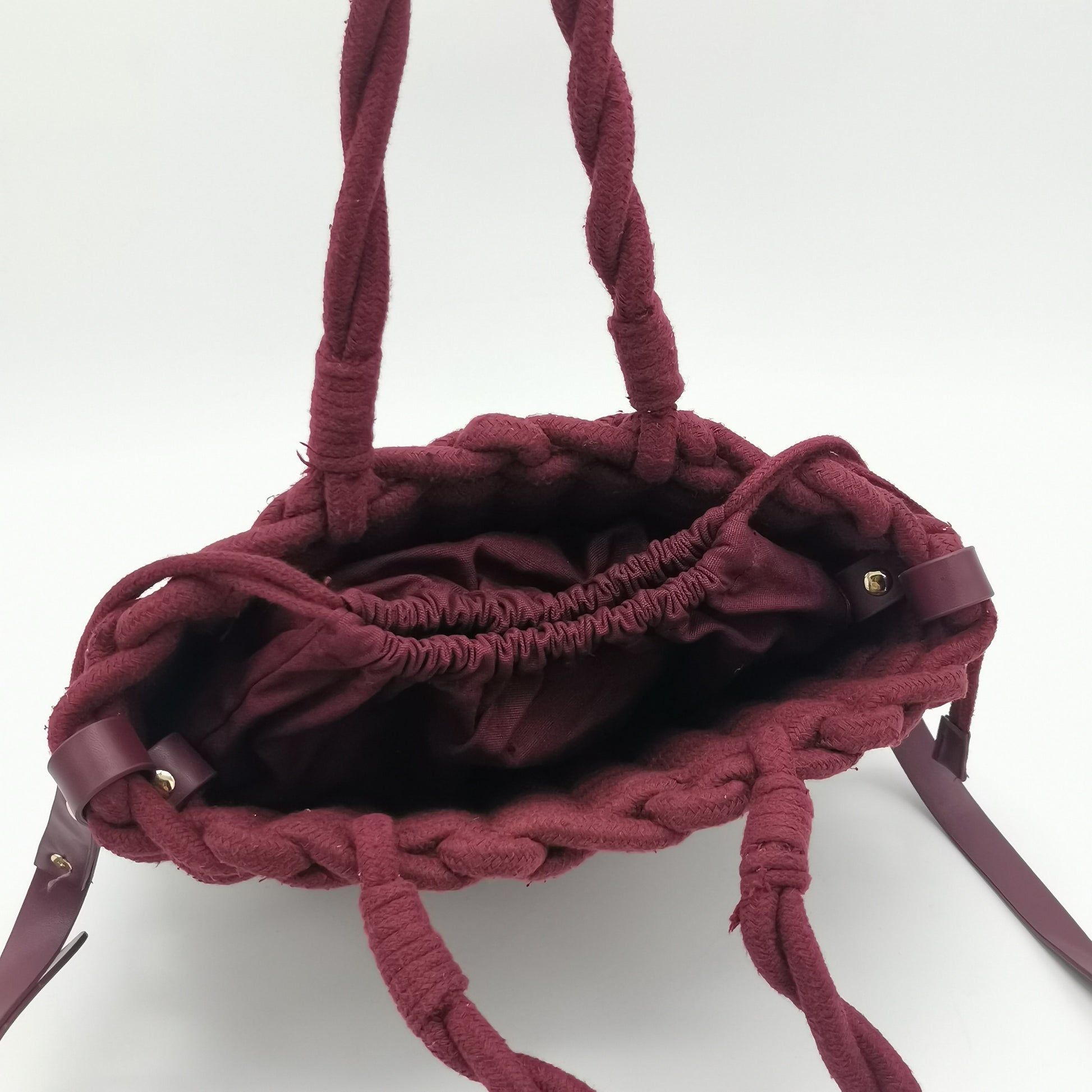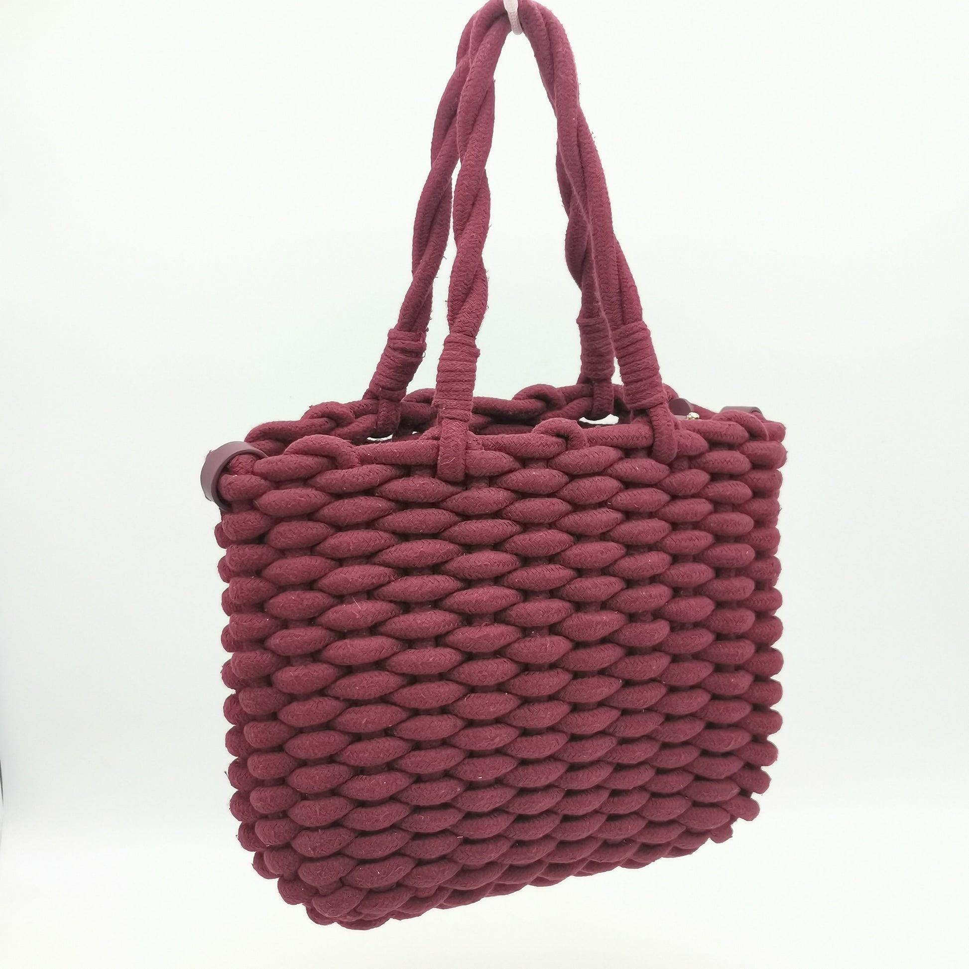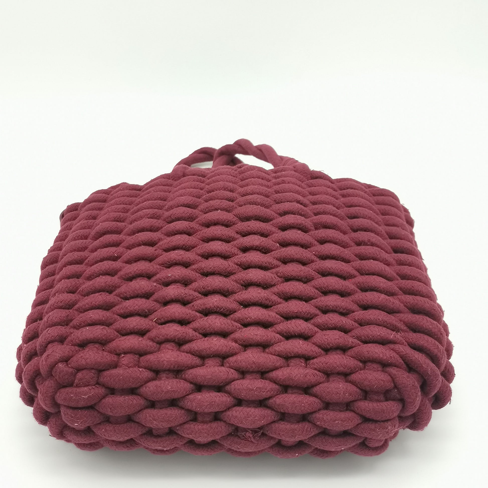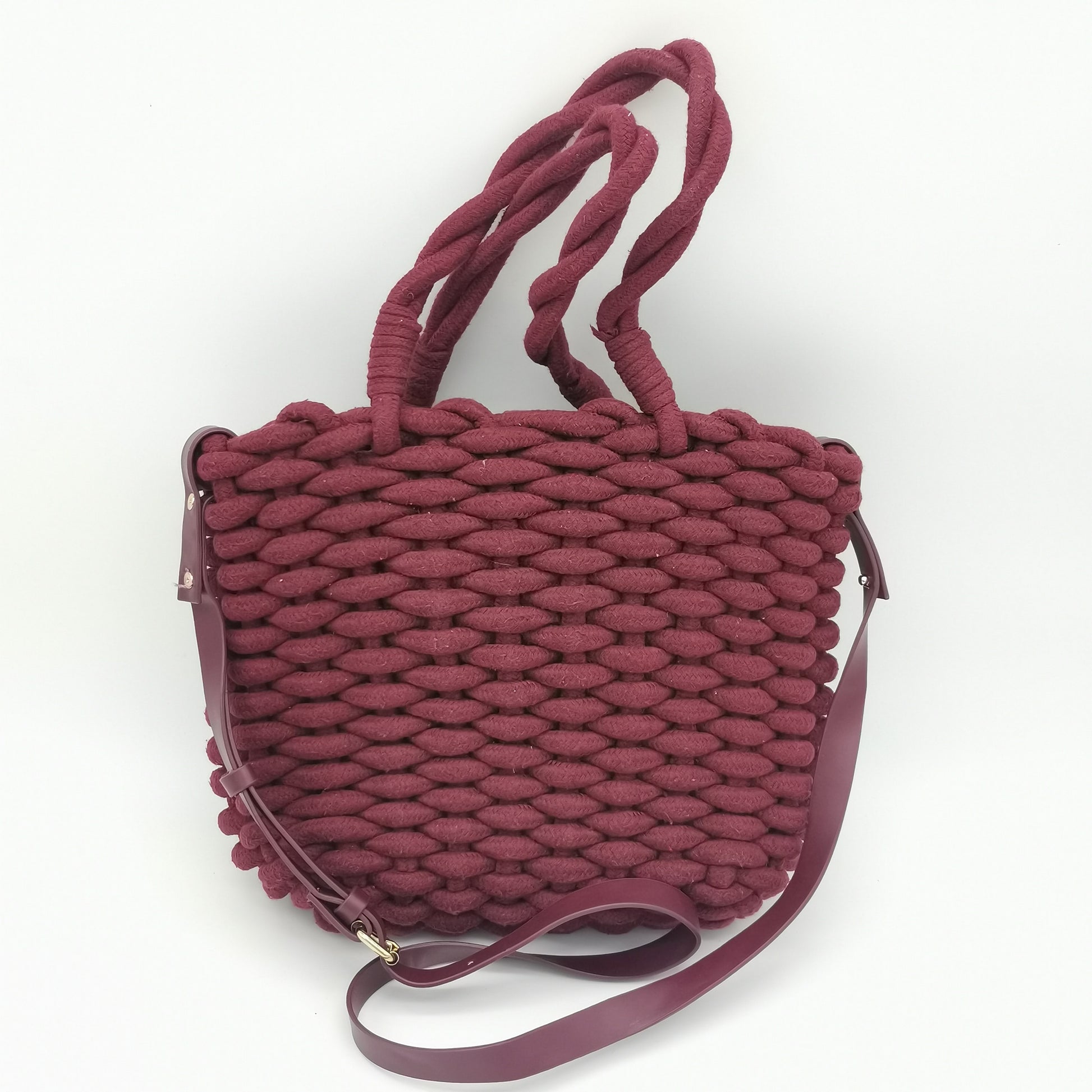 Burgundy woven braided rope handbag. Top handles and a detachable and adjustable shoulder strap, internal drawstring closure. Width 32 cm, height 25 cm, depth 6 cm.