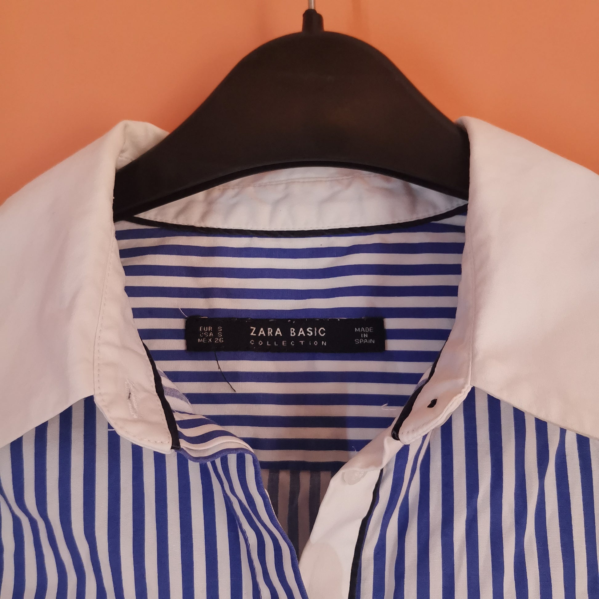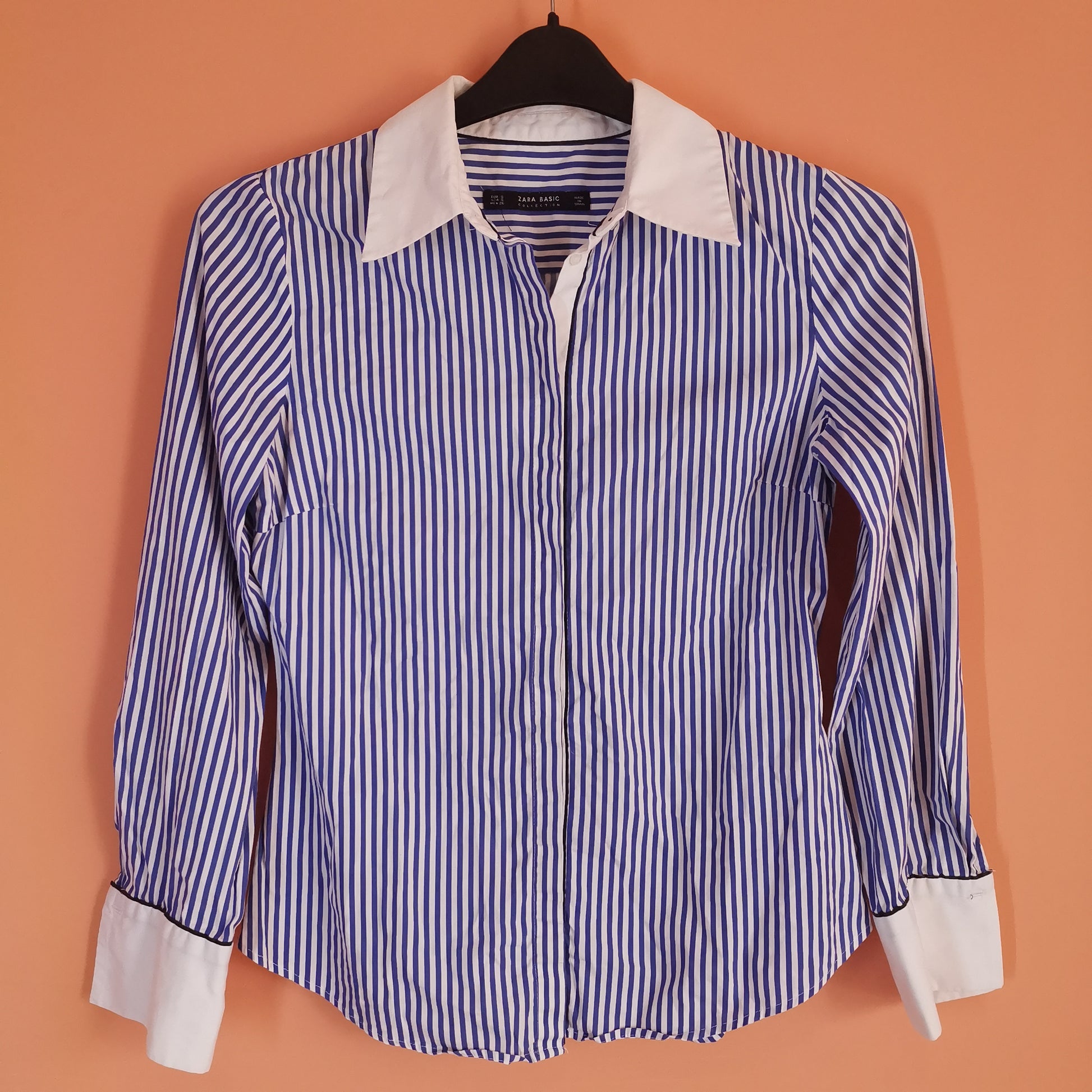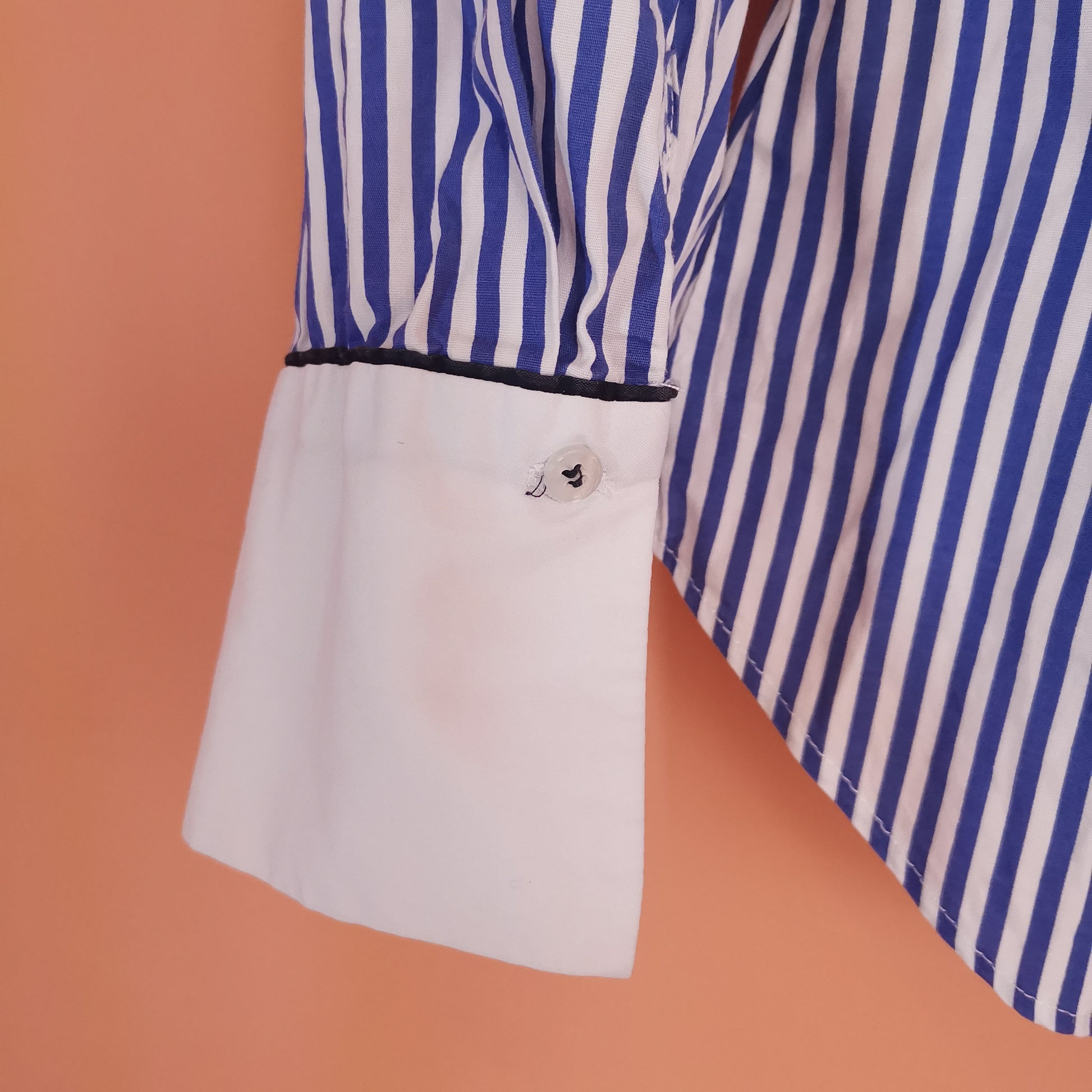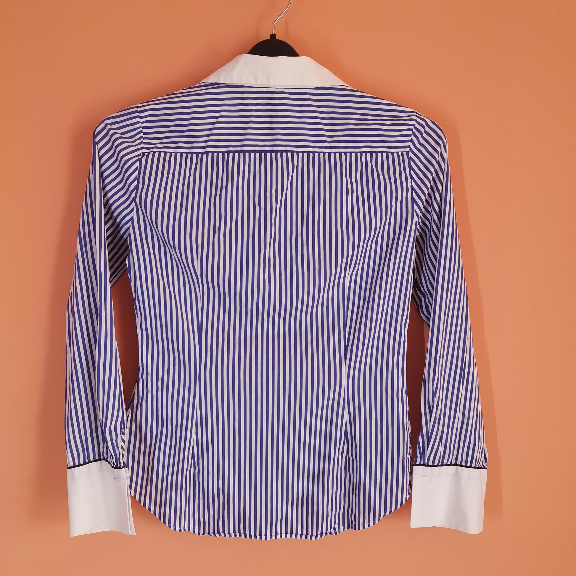 White and blue striped shirt made of cotton, polyamide and elastane. White collar and cuffs, button fastening.